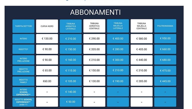 Vendita libera a partire da martedì 1 agosto presso il THE OFFICIAL PESCARA STORE di via Carducci 69, con orari negozio dal lunedì al sabato 10:00 / 13:00 e 16:30 / 20:00. Il diritto di prelazione, in vigore soltanto nel primo periodo di vendita (dal 14 luglio al 31 luglio) è dedicato esclusivamente ai soli abbonati 22/23 e darà la possibilità di prenotare il precedente posto a sedere e usufruire della scontistica dedicata. Dal 1 agosto, con la seconda fase denominata vendita libera, decade il diritto di prelazione sul posto ma non la scontistica che rimane in vigore sino al termine delle vendite. La data di chiusura della Campagna Abbonamenti 23/24 sarà stabilita dopo la definizione dei calendari ufficiali di Lega Pro.La nuova tariffa SCHOOL EXPERIENCE è la novità per questa stagione sportiva, una tariffa che guarda alle famiglie e che darà diritto all’accesso nel Family Club, con area giochi, e la partecipazione a 2 Delfino Experience con allenamento di un’ora sul campo dello Stadio Adriatico e con i tecnici del Pescara Calcio e la visita degli spogliatoi nel pre partita.