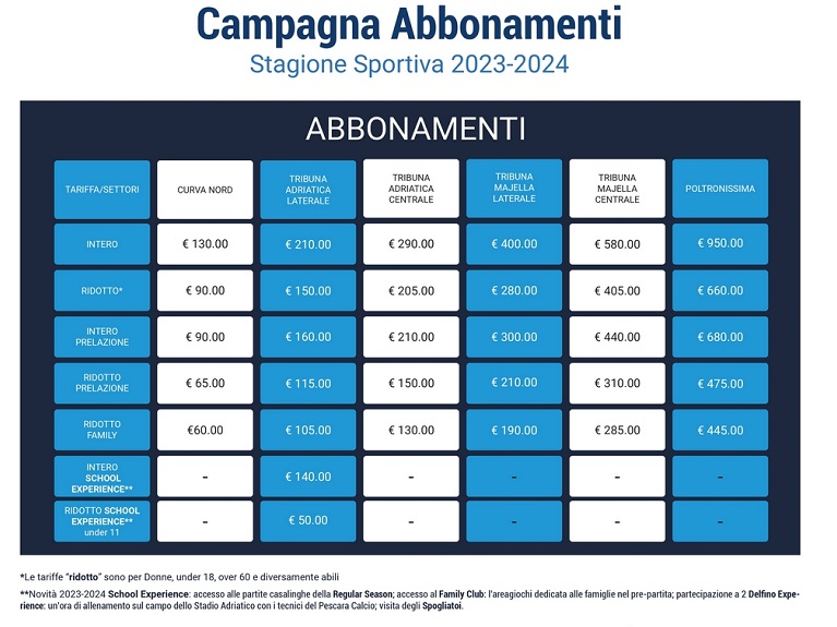 Vendita libera a partire da martedì 1 agosto presso il THE OFFICIAL PESCARA STORE di via Carducci 69, con orari negozio dal lunedì al sabato 10:00 / 13:00 e 16:30 / 20:00. Il diritto di prelazione, in vigore soltanto nel primo periodo di vendita (dal 14 luglio al 31 luglio) è dedicato esclusivamente ai soli abbonati 22/23 e darà la possibilità di prenotare il precedente posto a sedere e usufruire della scontistica dedicata. Dal 1 agosto, con la seconda fase denominata vendita libera, decade il diritto di prelazione sul posto ma non la scontistica che rimane in vigore sino al termine delle vendite. La data di chiusura della Campagna Abbonamenti 23/24 sarà stabilita dopo la definizione dei calendari ufficiali di Lega Pro.La nuova tariffa SCHOOL EXPERIENCE è la novità per questa stagione sportiva, una tariffa che guarda alle famiglie e che darà diritto all’accesso nel Family Club, con area giochi, e la partecipazione a 2 Delfino Experience con allenamento di un’ora sul campo dello Stadio Adriatico e con i tecnici del Pescara Calcio e la visita degli spogliatoi nel pre partita.