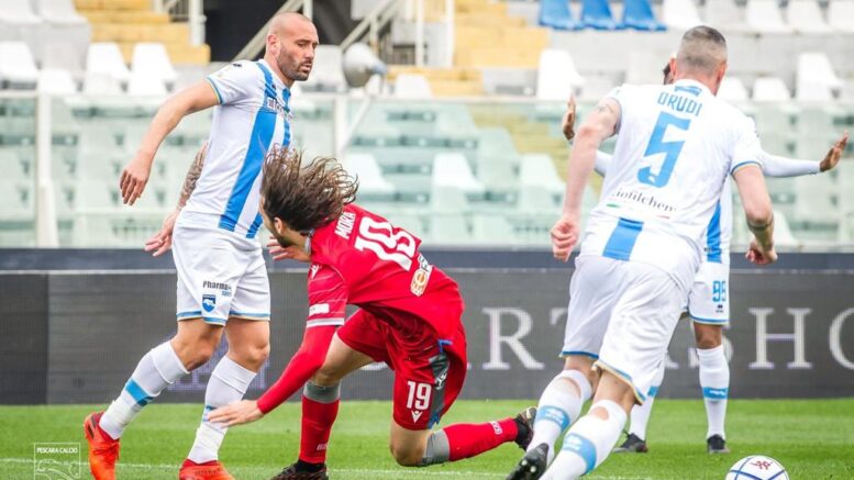 Foto (Pescara calcio): la caduta in area di Mora, centrocampista della Spal.
