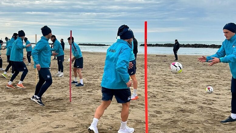 Pescara calcio: dopo il ko patito ieri sul campo della Torres (terzo nelle ultime 6 gare) ripresa della preparazione. La squadra si è allenata in spiaggia (foto). Sabato prossimo alle ore 17,30 impegno interno col Rimini sconfitto di misura a Chiavari (2-1). Torneranno a disposizione Valzania e Tonin.