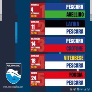 Serie C. Ecco le date e gli orari delle prime 5 giornate di campionato. Il Pescara debutterà in casa domenica 4 settembre alle 20,30 contro l’Avellino. Mercoledì 14 il primo turno infrasettimanale: Pescara-Crotone alle 21.