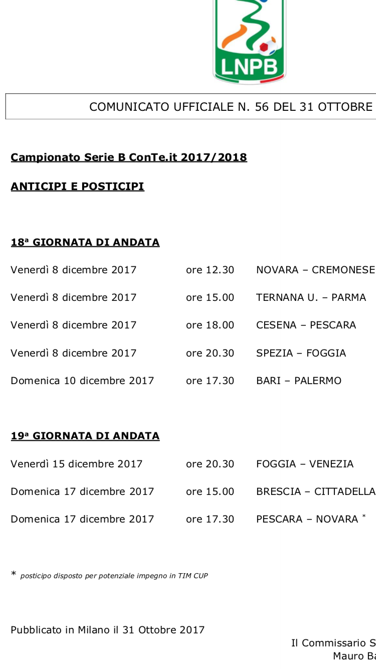 Resi noti anticipi e posticipi delle giornate 18 e 19. Il Pescara giocherà venerdì 8 dicembre alle 18 a Cesena e domenica 17 dicembre alle 17 30 in casa contro il Cittadella.