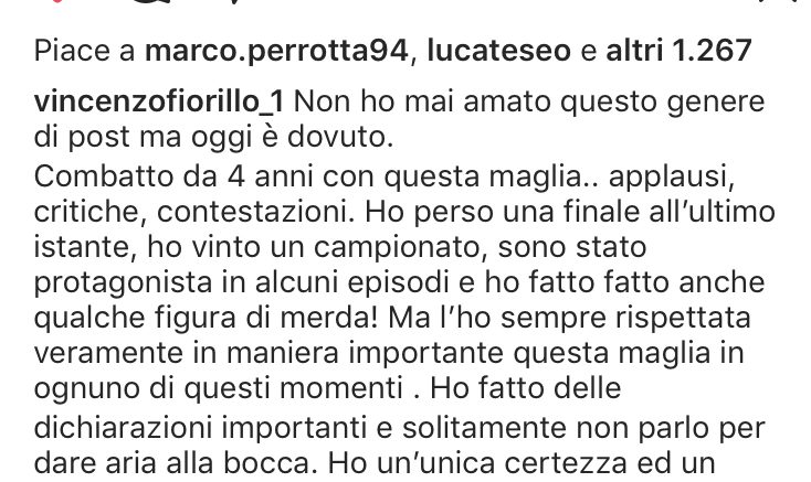 Con un post su Instagram ( vedi foto) Vincenzo Fiorillo rifiuta il Quarbag e decide di restare a Pescara. Un gesto molto apprezzato dai tifosi e dalla società. Sarà il futuro capitano?