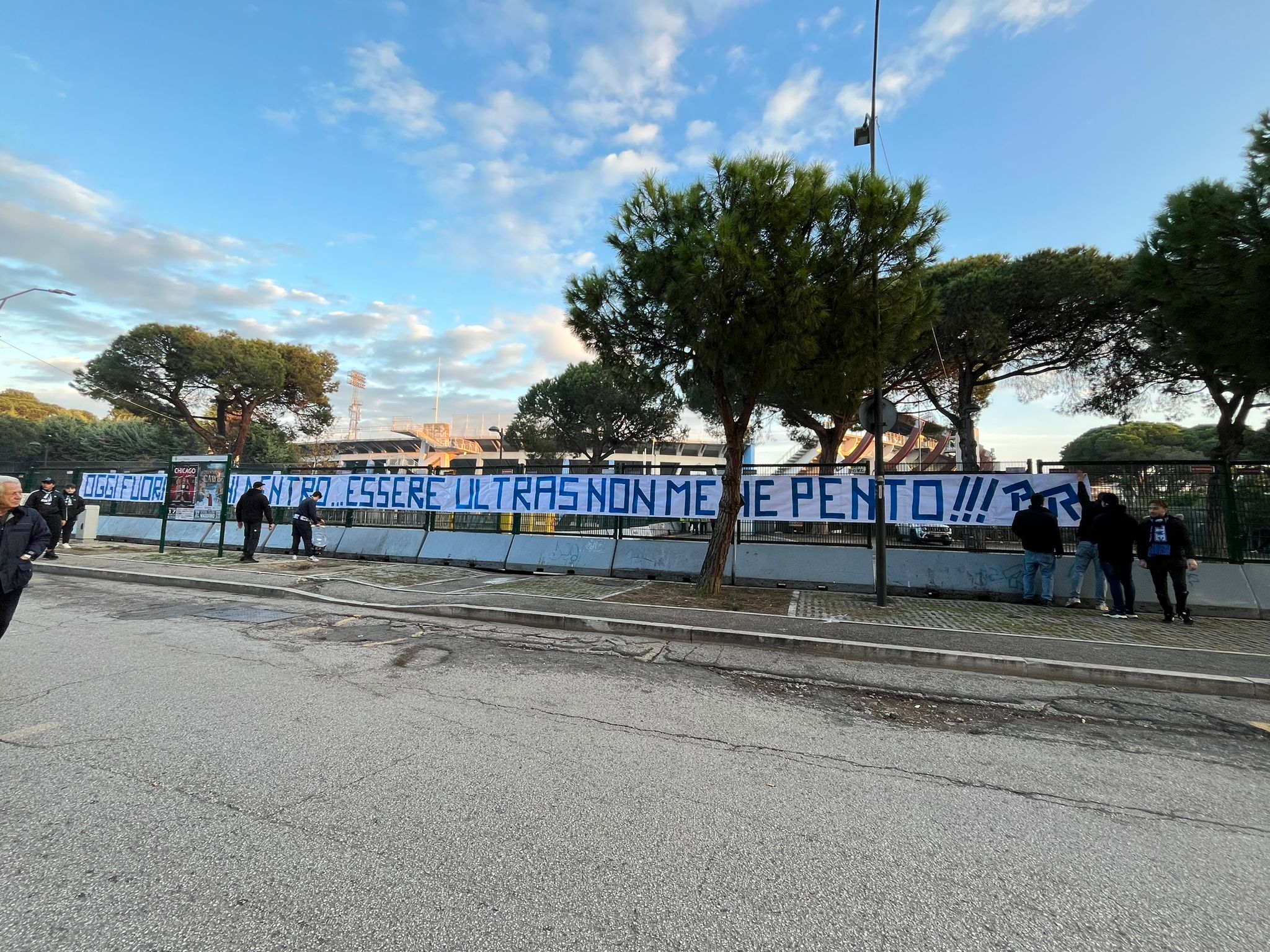 Si gioca senza i tifosi biancazzurri in curva nord: il settore dello stadio è stato chiuso dal giudice sportivo per un turno. I supporters del tifo organizzato seguiranno la partita su via Pepe, fuori dai cancelli dello stadio. Esposto anche uno striscione (nella foto). In curva bambini del settore giovanile del Pescara a colorare il settore.