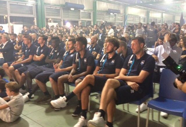La pioggia ha condizionato l’evento che doveva tenersi nella suggestiva cornice dell’anfiteatro del “Marina” di Pescara. Veloce cambio di programma e la manifestazione si è tenuta all’interno del padiglione della Camera di Commercio. Tanti i curiosi e i tifosi intervenuti all’appuntamento. Cori, bandiere e un entusiasmo da stadio hanno accompagnato per l’intera serata i beniamini del Delfino mano mano che salivano sul palco per un saluto. I tifosi, in particolare, hanno spronato la società ad allestire una squadra capace di lottare per la salvezza in serie A. Il presidente Daniele Sebastiani ha assicurato che l’organico verrà rinforzato e si farà di tutto per centrare l’obiettivo. Stasera su Rete8 Sport ampia differita a partire dalle 20.00.