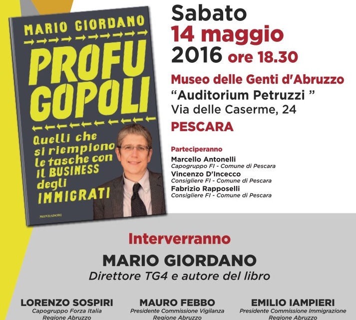 All’Auditorium Petruzzi di Pescara sabato 14 aprile la presentazione di “Profugopoli” di Mario Giordano alle 18,30. L’evento è promosso dal capogruppo regionale di Forza Italia Lorenzo Sospiri.