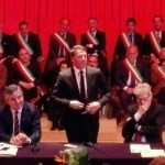 A prendere la parola per primo è stato il governatore abruzzese: “Quando sei venuto il 25 agosto hai annunciato il masterplan per Sud e ti eri augurato che l’Abruzzo fosse tra i primi a firmare e oggi siamo arrivati qui. Ti ringrazio anche per l’atteggiamento nella difesa del mare blu contro i pezzi di ferro, che era stato il tema prevalente di quella giornata”. E sulla ricostruzione a L’Aquila il governatore ha aggiunto: “Da quando ci sei tu abbiamo avuto le risorse per questa città ferita; oggi abbiamo 6 miliardi e 92 gru, quasi come una alberazione tecnologica. Qui si coltiva anche ricerca con università e Gssi; qui si coltiva lavoro di qualità. Questa città ha bisogno di un ulteriore aiuto, affinché il bilancio comunale possa uscire dalle secche e dalla sacche”, ha aggiunto parlando del contributo straordinario che occorre al Comune capoluogo per compensare minori entrate dovute al sisma e approvare il bilancio. Poi sul Masterplan ha aggiunto: “Abbiamo messo in campo 77 interventi, alcuni meriterebbero la santificazione. Cialente scherza sulla mia religiosità: oggi è San Pasquale di Baylon, protettore dei pastori, e noi ci siamo messi in cammino davvero come pastori. Su tutti la diga di Chiauci, da 40 anni in attesa di completamento, farà funzionare la Pilkington”.