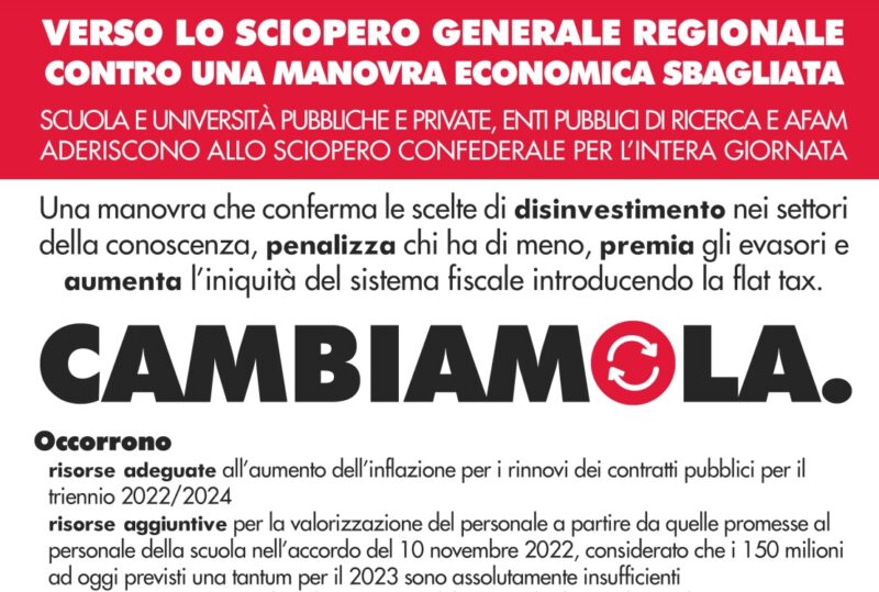 La scuola partecipa allo sciopero generale del 15 dicembre proclamato dalla Cgil Abruzzo. Contro una legge di bilancio che continua a impoverire il sistema pubblico d’istruzione abruzzese