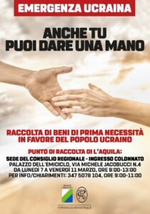 Come già fatto a Pescara la raccolta di beni di prima necessità si farà anche all’Aquila per sostenere la popolazione in fuga dalla propria terra. Il Consiglio tutto ha accolto la proposta e così da lunedì 7 marzo dalle 9 alle 13 e sino a venerdì 11 marzo, sempre nello stesso orario, sarà possibile donare beni di prima necessità per gli ucraini che stanno raggiungendo l’Abruzzo in queste ore. Chi volesse aiutare può recarsi all’Aquila a Palazzo dell’Emiciclo, sede del Consiglio, ingresso colonnato dove troverà personale dedicato che raccoglierà le donazioni che poi saranno distribuite a Comuni e a organizzazioni no profit che stanno accogliendo i profughi. Sembrerebbe una cosa banale ma nella pratica così non è.