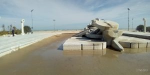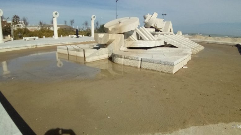 Dopo il maltempo dei giorni scorsi Pescara si è trovata con delle dune di sabbia per tutto il lungo mare. La nave di Cascella, situata nell’arenile della riviera nord di Pescara, rappresenta una nave stilizzata all’interno di una vasca d’acqua. In questi giorni al posto dell’acqua la barca si appoggiata su un cumulo notevole di sabbia.
