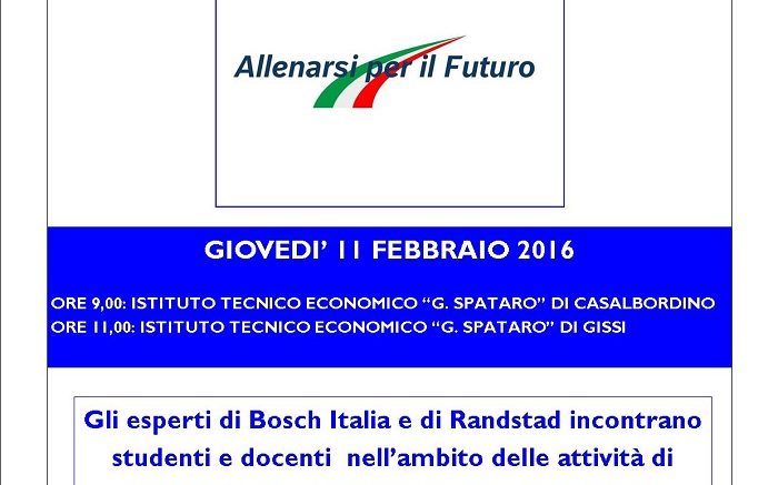 “Allenarsi per il Futuro” è il progetto di Bosch e Randstad che propone una serie di iniziative mirate ad orientare i giovani al loro futuro professionale. Giovedì 11 febbraio, alle ore 9.00 presso l’ITE “G. Spataro” di Casalbordino e alle ore 11.00 presso l’ITE “G. Spataro” di Gissi, gli studenti avranno modo di confrontarsi con i rappresentanti di Bosch e Randstad per un incontro di orientamento ed alternanza scuola-lavoro, ricevendo consigli sulle professioni più promettenti e le migliori strategie per raggiungere gli obiettivi professionali. I ragazziavranno la possibilità di confrontarsi con un fuoriclasse dello sport: Riccardo Pittis, campione di pallacanestro. Attraverso la metafora dello sport, infatti, l’incontro indicherà agli studenti l’importanza di compiere scelte professionali corrispondenti alle proprie attitudini e alle richieste del mercato, “allenando” il proprio talento per raggiungere l’obiettivo professionale. Il progetto “Allenarsi per il Futuro” raccoglie una serie di iniziative per valorizzare gli strumenti di orientamento e crescita professionale, coinvolgendo i ragazzi in un confronto aperto e proponendo a scuole e istituti una formazione pratica, attraverso tirocini o ore di laboratorio in azienda.