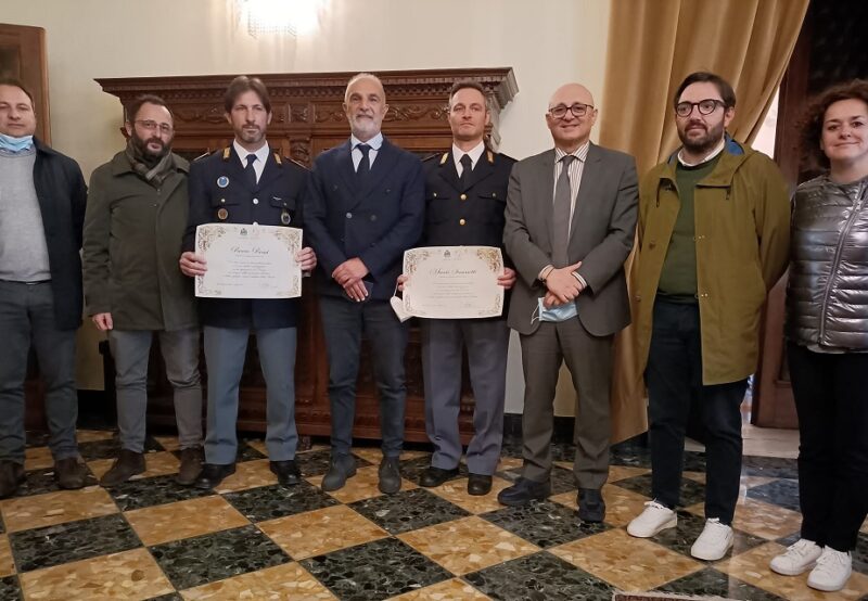 L’amministrazione comunale di Pescara ha conferito questa mattina, nel corso di una breve cerimonia, una pergamena di benemerenza a Mario Iannetti e Rocco Rossi, assistenti-capo coordinatori presso la Digos della Questura, in segno di gratitudine per l’eccellente contributo prestato alla comunità in occasione del danneggiamento della corona d’alloro e del vilipendio della lapide posta in piazza Martiri Giuliani e Dalmati per mantenere viva la memoria di quelle sofferenze patite dei connazionali, perseguitati, uccisi, infoibati. Grazie alla professionalità di Iannetti e Rossi, i tre autori del vile gesto furono assicurati alla giustizia. Le pergamene sono state consegnate dal sindaco Carlo Masci, presenti il questore Luigi Liguori e i consiglieri comunali Maria Luigia Montopolino, Vincenzo D’Incecco e Salvatore Di Pino.