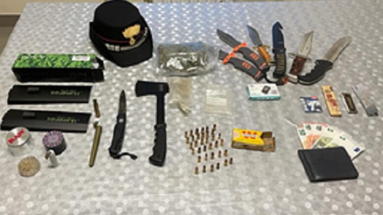 La perquisizione personale ha permesso di rinvenire e sequestrare un involucro contenente oltre 100 grami di marijuana, occultato negli slip indossati. La perquisizione è stata estesa, oltre che all’abitacolo del mezzo, anche al domicilio del perquisito, permettendo di ritrovare e sequestrare materiale utile per il confezionamento e consumo della sostanza stupefacente, nonché la somma di 80 euro in contanti, ritenuta provento della vendita della droga. I carabinieri impegnati nell’operazione hanno, inoltre, rinvenuto e sequestrato 35 cartucce calibro 6,35 e diversi armi da punta e taglio del tipo vietate.