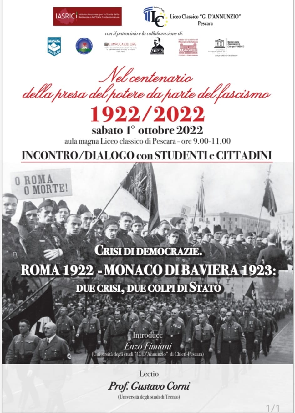 Il tema dell’incontro: “Crisi di democrazie: Roma 1922 – Monaco di Baviera 1923, due crisi, due colpi di Stato”. In occasione del centenario della presa del potere da parte del fascismo (1922-2022).