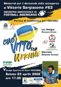 A dieci anni dalla scomparsa di Vittorio Sargiacomo, manager e sportivo pescarese stroncato da un malore durante un viaggio di lavoro a Pechino, la famiglia Sargiacomo, d’intesa con Alberto Carulli della UISP, ha organizzato un incontro amichevole di beneficenza per l’Ucraina che, il 23 aprile, metterà a confronto le squadre di football americano dei Los Amigos Pescara Crabs e i Veterans Ancona Dolphins