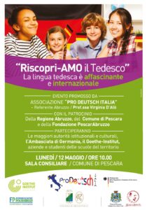 Lunedì 12 maggio, la Sala Consiliare del Comune di Pescara ospiterà “Ri Scopri-Amo il tedesco!”, evento promosso dalla Organizzazione Nazionale Pro Deutsch Italia – Sezione Abruzzo, con il patrocinio di Comune, Regione Abruzzo, Fondazione PescarAbruzzo.