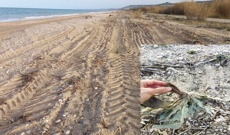 “Abbiamo potuto constatare nei giorni scorsi i segni del passaggio indiscriminato di mezzi meccanici su questo tratto di litorale, per una lunghezza di quasi due chilometri, osservando segni inequivocabili delle alterazioni della sua morfologia, con solchi, livellamenti di sedimenti ghiaiosi e sabbiosi e, su tutto, con diversi esemplari di piante spontanee estirpati e danneggiati, tra cui il raro Polygonum maritimum e il Verbascum niveum, pianta presente nell’elenco delle specie protette”.