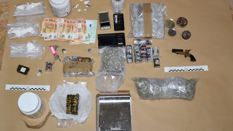 Una volta rinvenuto lo stupefacente, gli investigatori si sono portati all’interno di un garage in uso allo stesso pregiudicato, dove hanno rinvenuto e sequestrato altra sostanza stupefacente del tipo cocaina per un peso complessivo di gr.150. La perquisizione è stata estesa all’abitazione dove è stato trovato il quantitativo maggiore di droga: kg 2,5 di hashish e gr. 580 di marijuana. La perquisizione ha permesso di rinvenire e sequestrare anche una pistola calibro 6 a 4 canne, con relative cartucce, risultata compendio di furto. Pertanto l’uomo è stato tratto in arresto per detenzione ai fini di spaccio di sostanza stupefacente e indagato in stato di libertà ai sensi dell’art. 648 e 697 c.p. per la ricettazione e la detenzione abusiva dell’arma.