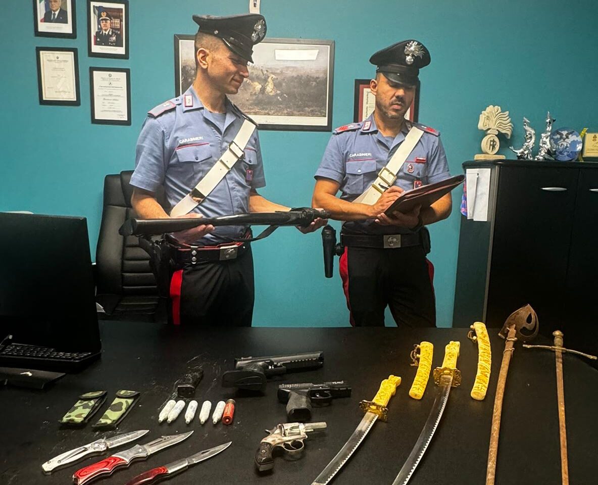 I militari erano intervenuti nell’abitazione dell’uomo a seguito di denuncia per minaccia presentata dall’ex convivente. Dalla perquisizione domiciliare viene alla luce un piccolo arenale: una pistola a tamburo di grosso calibro con regolare matricola ma non denunciata, sette armi bianche, una replica di un fucile da caccia e 2 pistole da “soft air” con munizionamento prive del tappo rosso, armi poste in sequestro.
