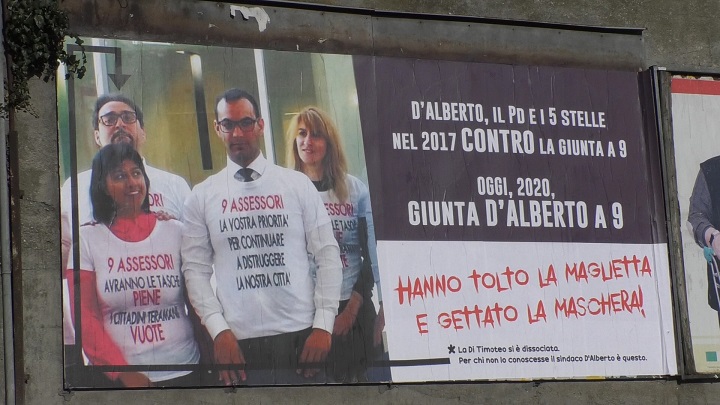 “Hanno tolto la maglietta e gettato la maschera”, la scritta commenta una foto nella quale alcuni consiglieri dell’allora opposizione, tra cui il sindaco Gianguido D’Alberto, indossano t-shirt contro l’allargamento a nove assessori della giunta guidata da Maurizio Brucchi. L’immagine risale infatti al 2017 e sottolinea che, a poco più di tre anni di distanza, l’attuale primo cittadino ha adottato lo stesso provvedimento che allora aveva tanto contestato.
