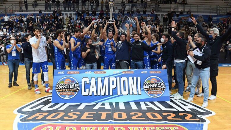Gioia Roseto. In un PalaMaggetti gremito la Liofilchem Roseto alza la Coppa Italia di serie B al termine di un match combattutissimo contro i friulani della UEB Gesteco Cividale. Il risultato finale: 69-65 (primo tempo 32-43).