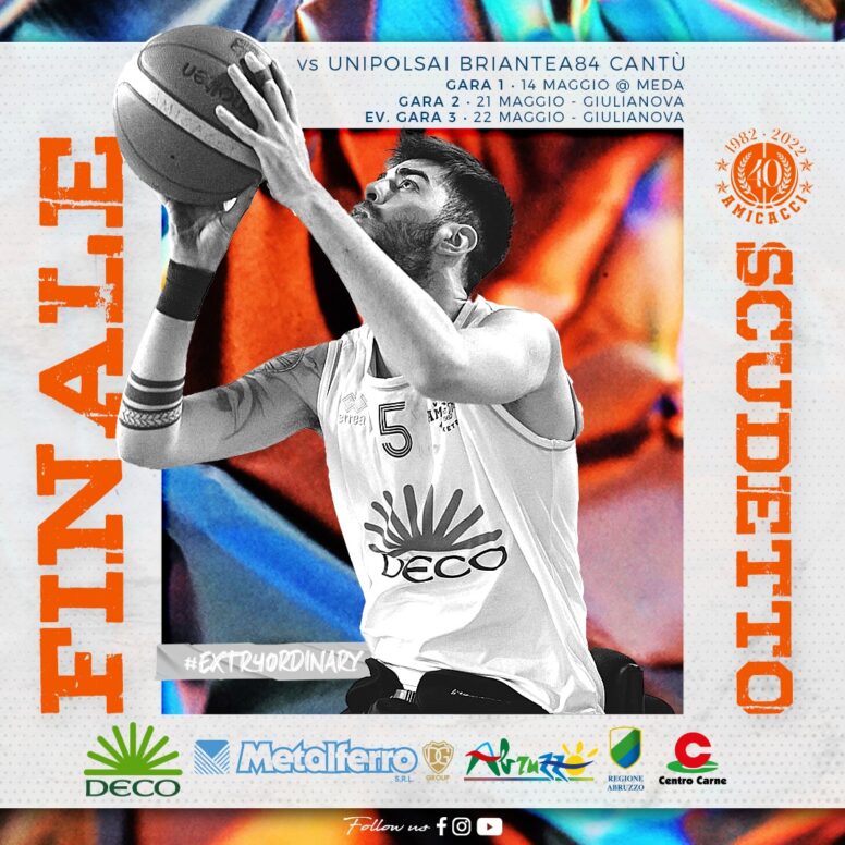 La Deco Metalferro Amicacci Abruzzo si aggiudica il primo round della finale scudetto di basket in carrozzina, battendo 67-70 in trasferta i campioni d’Italia uscenti della Briantea Cantù. Gara 2 sabato prossimo 21 maggio al PalaCastrum di Giulianova. In caso di bis sarà tricolore.