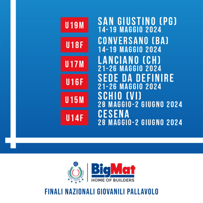 Successivamente, da martedì 21 a domenica 26 maggio, si disputerà a Lanciano (CH) la finale nazionale Under 17 maschile. La sede della finale nazionale under 16 femminile in programma negli stessi giorni sarà invece definita e deliberata nelle prossime settimane.