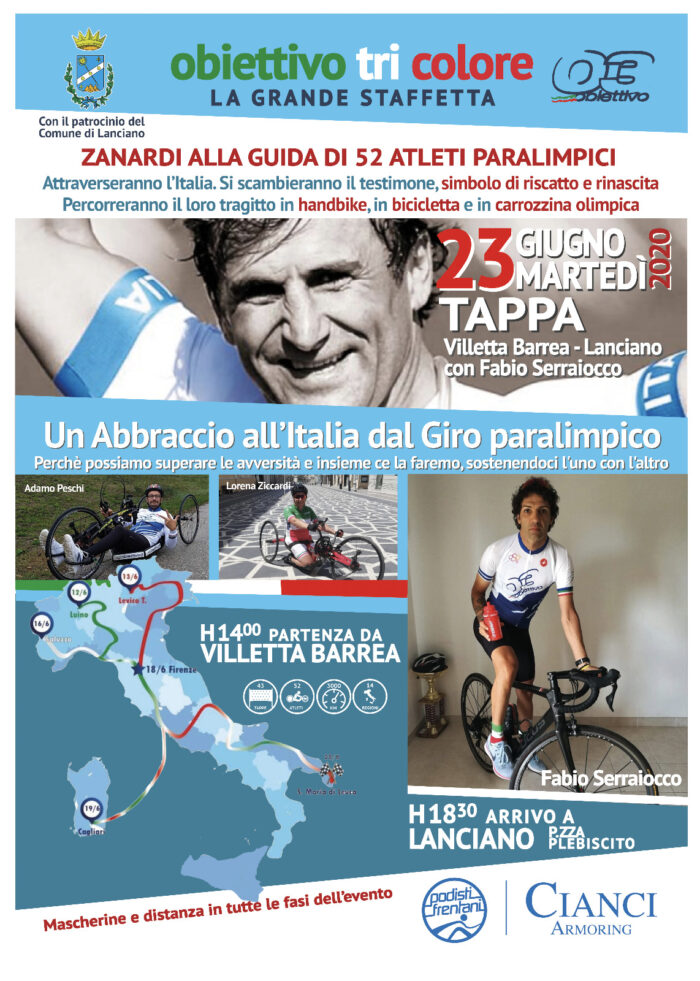 In onore di Alex Zanardi, i protagonisti della staffetta e tutta la carovana di Obiettivo Tricolore hanno deciso di proseguire il viaggio verso Santa Maria di Leuca, in Puglia, dove il 28 giugno terminerà la manifestazione organizzata a scopo solidale e puramente dimostrativo, come segno di rinascita verso lo sport italiano e il mondo paralimpico duramente colpiti dall’emergenza Covid-19.