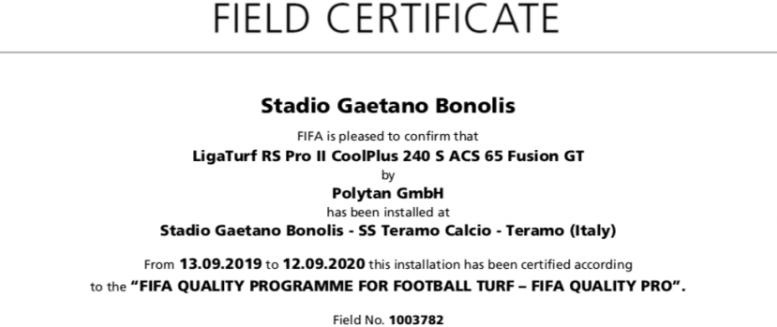 “La S.s. Teramo Calcio rende noto che è ufficialmente pervenuto il certificato FIFA Quality PRO relativo al nuovo manto installato presso lo stadio “Gaetano Bonolis”.