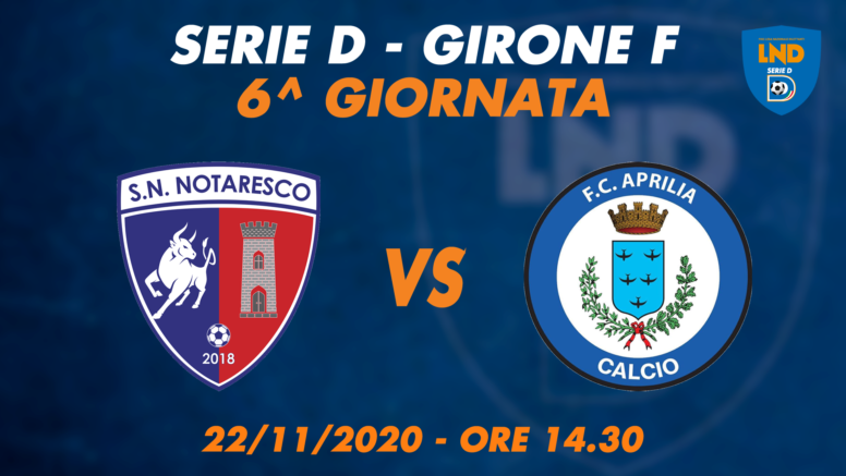 Si gioca domani alle 14:30 S.N. Notaresco Aprilia, recupero della 6^ giornata del campionato di serie D, girone F. Gara a porte chiuse; diretta streaming della partita sulla pagina Facebook della società.