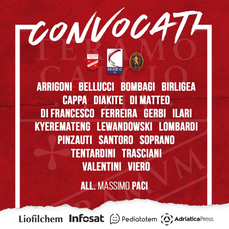 Già tempo di rifinitura per il Teramo, atteso domani dal confronto casalingo con il Potenza (fischio d’inizio alle ore 15:00 – arbitro Acanfora di Castellammare di Stabia). Il tecnico Massimo Paci ha convocato 21 calciatori. Diversi gli assenti.