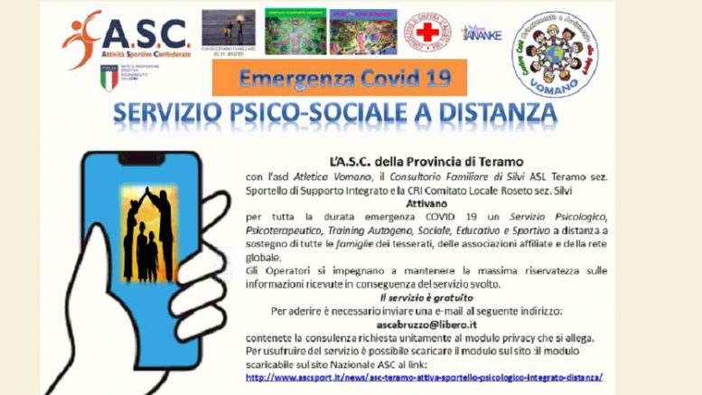 Il Comitato Provinciale ASC (Attività Sportive Confederate) Teramo, l’Atletica Vomano e il consultorio familiare di Silvi hanno attivato uno sportello socio- psicologico integrato a distanza, con alcune figure professionali quali psicologi; assistenti sociali; sociologi; pedagogisti e naturalmente istruttori, tecnici e laureati in scienze motorie. Le figure professionali coinvolte, a titolo di volontariato, metteranno a disposizione le proprie competenze per un servizio di counselling psicologico e di attività motoria a favore di interi nuclei familiari dei tesserati di tutte le associazioni affiliate ASC del territorio abruzzese, in questo particolare momento di intensivo stress emotivo causata dall’emergenza Covid-19.