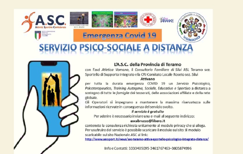 Il Comitato Provinciale ASC (Attività Sportive Confederate) Teramo, l’Atletica Vomano e il consultorio familiare di Silvi hanno attivato uno sportello socio- psicologico integrato a distanza, con alcune figure professionali quali psicologi; assistenti sociali; sociologi; pedagogisti e naturalmente istruttori, tecnici e laureati in scienze motorie. Le figure professionali coinvolte, a titolo di volontariato, metteranno a disposizione le proprie competenze per un servizio di counselling psicologico e di attività motoria a favore di interi nuclei familiari dei tesserati di tutte le associazioni affiliate ASC del territorio abruzzese, in questo particolare momento di intensivo stress emotivo causata dall’emergenza Covid-19.