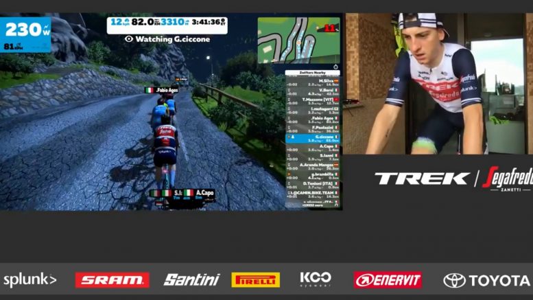 Nelle diverse discipline sportive si studiano nuove strategie per allenarsi . Nel ciclismo, dopo settimane trascorse sui rulli, un gruppo di atleti ha deciso di affrontare insieme una sfida virtuale ma reale nella fatica. Emanuele Onesti della Giotti Victoria e Giulio Ciccone della Trek Sedgafredo, due ciclisti abruzzesi uniti dalla stessa passione, quella per le due ruote da questa mattina, domenica 19 Aprile si stanno confrontando nell’affrontare una “montagna virtuale”, da scalare, come per voler esorcizzare il momento che tutti stanno vivendo. Collegati sulla piattaforma ZWIFT, in sella alle proprie bici, con l’ausilio del ciclomulino, hanno affrontato per dieci volte l’Alpe di Zwift, la versione virtuale della celebre salita francese, quell’Alpe d’Huez, monumento del ciclismo, tanto caro a tutti gli sportivi italiani. 12,2 chilometri per ogni singola salita, con una pendenza media dell’8,5% e 1035 metri di dislivello di scalata. L’ascesa totale sarà quindi superiore alla vetta più alta del mondo, l’Everest.
