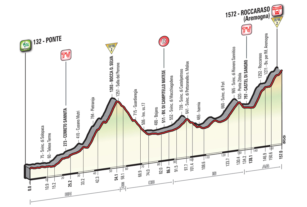 IL PERCORSO – Tecnicamente il tracciato è molto insidioso. Primi 20 km pianeggianti seguiti dalla prima salita (Bocca di Selva) che tra falsopiano di accesso e salita vera e propria porta ad issarsi per quasi 40 km con pendenze medio facili. Segue una discesa su strade ampie, ma con tratti dalla superficie usurata. Dal km 75 al km 135 si viaggia su strade a scorrimento veloce, ampie e prevalentemente rettilinee con diverse gallerie nella parte finale. Dopo Castel di Sangro (DOVE è POSTO UN TV) inizia la salita finale che porta all’arrivo. Erta finale di 17 km alla media del 4.8%. Prima parte abbastanza ripida con un breve tratto che arriva fino al 12% seguita da un tratto in falsopiano (attraversamento dell’abitato di Roccaraso). A 7 km dall’arrivo si riprende a salire con pendenze variabili dal 7% al 4%. Ultimo km al 7% con rettilineo finale lungo 120 m tutto in salita. Venerdì partenza da Sulmona per Foligno.