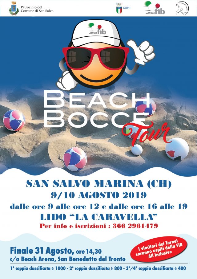 Location del Tour, organizzato in Abruzzo dal Circolo Bocciofilo “Il Comunale di San Salvo” con il patrocinio del Comune di San Salvo, sarà il lido “La Caravella” che ospiterà le gare dalle ore 09.00 alle 12.00 e dalle 16.00 alle 19.00. La manifestazione ha un valenza altamente inclusiva ed è aperta a tutti: donne, uomini, giovani, adulti, anziani, diversamente abili, turisti, residenti e anche a chi non si è mai cimentato con questo sport. Iscriversi è davvero semplice e non è necessario essere già tesserati alla Federazione Italiana Bocce: il costo di iscrizione è di quindici euro per la coppia, quota comprensiva della tessera agonistica per la stagione 2019/2020. I vincitori delle tappe regionali parteciperanno, invitati della Federazione Italiana Bocce, al “Beach Arena” di San Benedetto del Tronto, dove sabato 31 agosto, si terrà la finale nazionale.