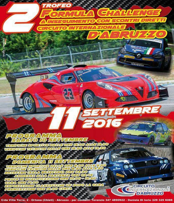 Domenica 11 settembre appuntamento da non perdere per tutti gli appassionati di motori e non solo. Al circuito internazionale d’Abruzzo ad Ortona ecco il secondo trofeo Formula Challenge con tantissime vetture protagoniste con tante novità. Sarà un piccolo motor show : Alfa 4c, Mitsubishi Lancer, Renault, prototipi. Tanti ingredienti per vivere una giornata indimenticabile. Appuntamento dalle 9 45 fino alle 17 30. Gli appassionati potranno seguire le evoluzioni dei piloti direttamente dalle tribune gustandosi lo spettacolo di vetture di primissimo livello presenti ad Ortona. Presente il pluricampione italiano di velocità montagna Marco Gramenzi su Alfa 4C , Fabrizio Caprioni su Seat Leon supercopa, Andra Vellei su prototipo, Daniele Di Iorio su Lancer evo 9.