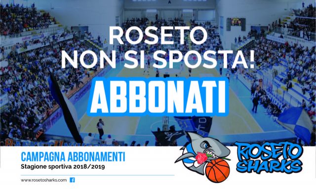 “Roseto non si sposta ! Abbonati”. E’ lo slogan scelto dalla società per la nuova campagna abbonamenti degli Sharks in serie A2 nella stagione 2018-2019. Gli abbonamenti sottoscritti nella Fase 1 godranno di uno sconto del 10% grazie all’ingresso gratuito per gli abbonati nella giornata biancazzurra, oltre alla prelazione ai vecchi abbonati per la conferma del posto occupato la scorsa stagione sportiva. Tutti gli abbonati potranno beneficiare inoltre di ulteriori agevolazioni così come sono previsti nuovi abbonamenti ridotti con risparmi consistenti per gli Under 14 e per i ragazzi da 14 a 19 anni, per gli studenti universitari, gli Over 65, i militari in servizio, i tesserati delle squadre di basket abruzzesi e delle società cestistiche di Roseto. Per questo motivo nella stagione sportiva non sono previsti biglietti ridotti. Gli abbonamenti sottoscritti dopo il 2 Settembre manterranno comunque gli stessi prezzi dello scorso anno.