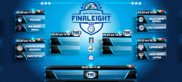 Sorteggiati gli abbinamenti della Final Eight di Coppa Italia, manifestazione che si svolgerà dal 23 al 26 marzo nelle Marche (a Tolentino le gare dei quarti) e in Abruzzo (a Pescara semifinali e finali). Ad aprire la manifestazione, giovedì 23 alle ore 11 (orario scelto, come accade da diversi anni, per favorire l’afflusso degli studenti al palazzetto), saranno Pescara e Imola. Nel pomeriggio alle 15.30, toccherà a Acqua&Sapone Unigross-Kaos Futsal (ore 15.30); le altre partite sono Napoli-Cioli Cogianco e Luparense-Axed Group Latina (ore 20.30). Le vincenti si trasferiranno a Pescara per le semifinali presso il Pala Giovanni Paolo II, teatro per la quinta edizione consecutiva della fase finale della Coppa Italia, vinta nel 2016 proprio dai padroni di casa guidati da Fulvio Colini.