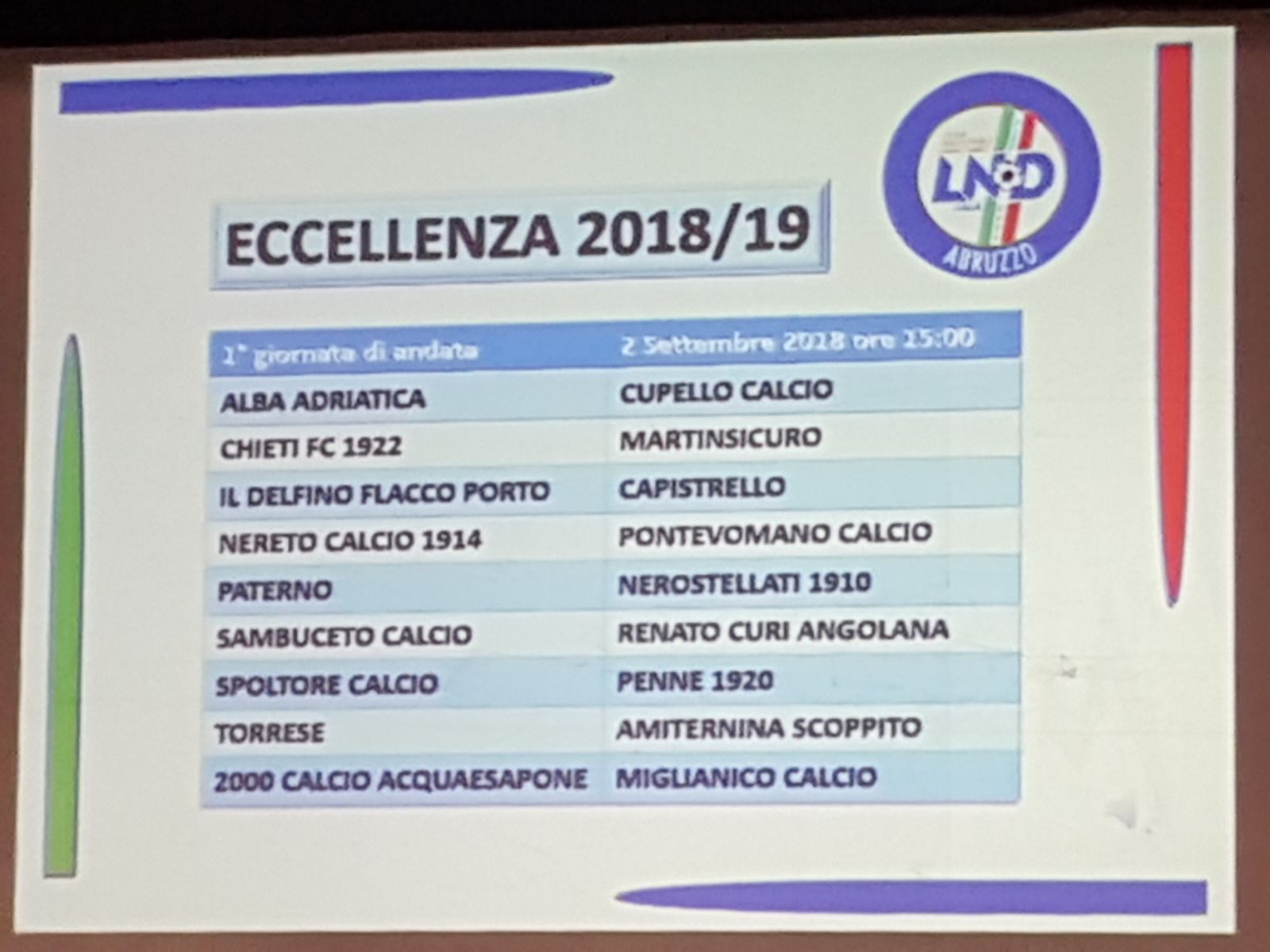 Alla presenza dell’assessore allo sport Silvio Paolucci, del presidente della Lega Pro Gabriele Gravina e del presidente regionale della figc Daniele Ortolano sono stati presentati i calendari di eccellenza e promozione ( NELLA FOTO LA PRIMA DI ECCELLENZA). Il Chieti debutterà in casa domenica contro il Martinsicuro mentre i Nerostelati giocheranno a Paterno. Sulla questione L’Aquila Daniele Ortolano ha sottolineato il solito concetto. ” Attendiamo la decisione di Fabbricini, noi ci adegueremo come si adegueranno le altre società e come dovrà adeguarsi l’Aquila stessa. Ribadisco: nulla contro i rossoblù, nulla contro il Capoluogo. Decide Fabbricini. Ma la sensazione è che il veto sia stato piuttosto forte. Influenzerà nella decisione?
