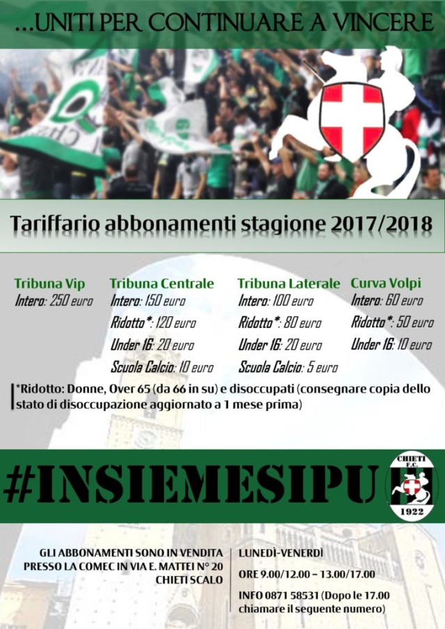 Sarà davvero una domenica speciale quella del 27 agosto per i tifosi neroverdi. In occasione della presentazione ufficiale della squadra che si svolgerà presso il campo della Villa Comunale, alle 19.22 ci sarà il raduno degli 89 Mai Domi in Piazza San Giustino. Da qui partirà un corteo che arriverà fino alla Villa Comunale (presumibilmente intorno alle 20,00), dove, come detto, si svolgerà la cerimonia di presentazione. Sarà anche presente uno stand, dove sarà possibile sottoscrivere l’abbonamento. La nuova campagna è stata denominata: “…UNITI PER CONTINUARE A VINCERE”. I prezzi vanno dai 60 euro della Curva Volpi (50 ridotto) ai 250 euro della Tribuna Vip. Per il dettaglio e le altre informazioni, si può consultare l’immagine che correda la notizia. Infine, sempre domenica 27, il Chieti giocherà l’andata di Coppa Italia allo stadio Angelini con il San Salvo. Fischio d’inizio alle ore 16.