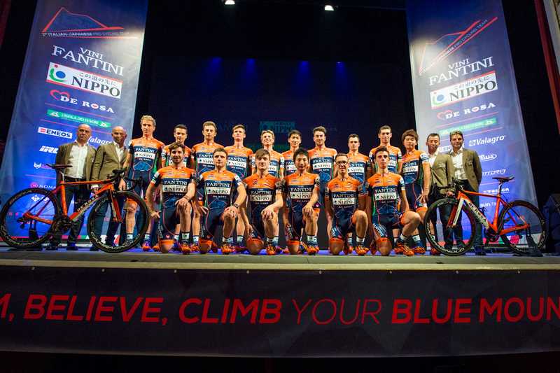 Ad applaudire Damiano Cunego e compagni, tanti appassionati, ma anche i grandi nomi del ciclismo, su tutti il presidente federale Renato di Rocco (abruzzese doc) e il ct della nazionale Davide Cassani. Sul palco gli interventi di sponsor e dirigenti e di Valentino Sciotti CEO (amministratore delegato) di Farnese Vini. Dopo il debutto dello scorso anno nella categoria Professional, il team dei confermati ds Stefano Giuliani e Mario Manzoni cui si è aggiunto il giapponese Fukushima, intende consolidarsi e soprattutto portare avanti un messaggio diverso che parta dall’etica. Sul fronte squisitamente sportivo, nella passata stagione il team ha centrato 11 vittorie: l’intendimento è migliorarsi. Oltre al confermato capitano Cunego, sul palco sono saliti gli altri corridori (il team ne conta 17, ma presto arriverà un altro italiano),molti dei quali giovani (nati dopo il 1^ gennaio 1990). Tra i nuovi il campione asiatico Under 23 Koishi, Grega Bole e Gianfranco Zilioli. Assente giustificato il giapponese Kuboki, impegnato in Australia con la sua Nazionale in chiave olimpica Rio 2016.