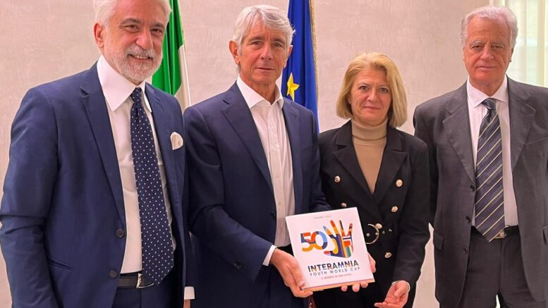 Il Comitato Organizzatore del Cinquantennale della Coppa Interamnia rappresentato dal Presidente Carlo Antonetti e dalla Vice Presidente Carmen Bizzarri, insieme a Pier Luigi Montauti, Patron dell’ l’Associazione Interamnia World Cup, hanno incontrato venerdì scorso a Roma il Ministro per lo Sport e i Giovani, Andrea Abodi, a cui sono stati illustrati i forti valori sportivi, culturali, sociali e di marketing territoriale che hanno sempre caratterizzato la Coppa e che saranno celebrati nel Cinquantennale della manifestazione.