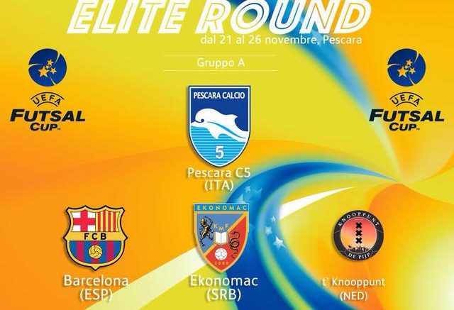 E’ stato definito il programma completo della partite del Gruppo A dell’Elite Round di Uefa Futsal Cup, appuntamento che si disputerà al Pala Papa Giovanni Paolo II di Pescara, dal 22 al 25 novembre prossimi. Al girone a quattro è presente anche la squadra biancazzurra guidata da Fulvio Colini che si è qualificata dopo la fase in Bielorussia. La gara inaugurale del 22 novembre con inizio alle 17.30 vedrà di fronte Barcellona e gli olandesi del T’ Knoppount; a seguire, con inizio alle 20,30, Pescara contro i serbi dell’Ekonomac. Il 23 novembre alle 17.30 è in programma Barcellona-Ekonomac; alle 20.30 Pescara-T’ Knoppount; infine, sabato 25 alle 17.30 T’ Knoppount-Ekonomac; alle 20.30 Pescara-Barcellona, gara questa che verrà trasmessa in diretta su Fox Sport.