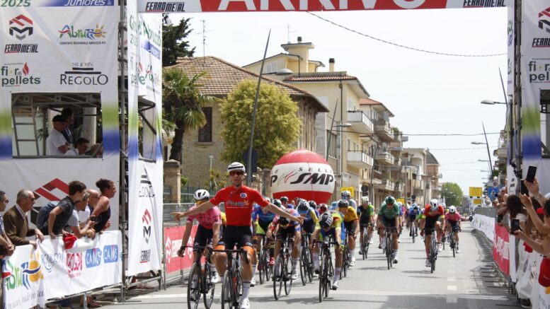 Sprint vincente di Alessio Magagnotti nella quarta e ultima tappa del Giro d’Abruzzo Juniores; la maglia azzurra di leader sulle spalle di Francesco Baruzzi