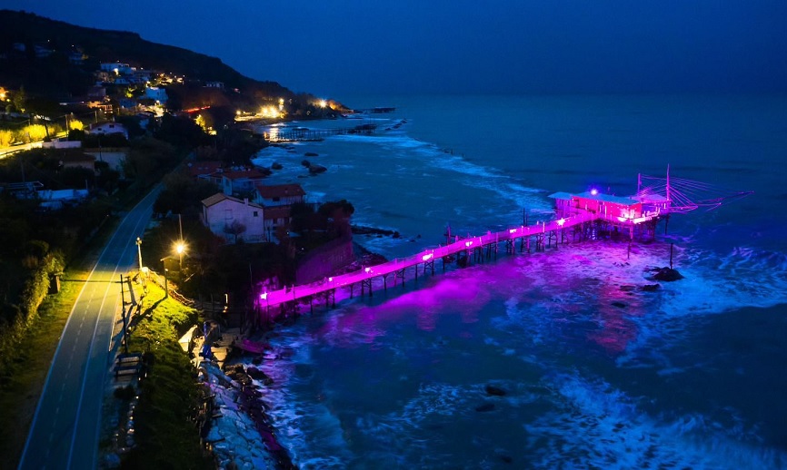 Fossacesia con i Trabocchi Pesce Palombo e Supporter Punta Rocciosa illuminati di rosa e la Via Verde della Costa dei Trabocchi sui media di tutta Europa