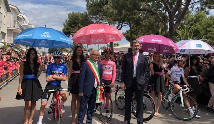 Il presidente della regione Abruzzo Marco Marsilio e il sindaco di Tortoreto Domenico Piccioni ( insieme nella foto) hanno dato il via alla tappa numero otto del Giro d’Italia. Tantissimi gli appassionati che hanno gremito il lungomare, un applauso particolare per i due abruzzesi del gruppo Giulio Ciccone in maglia blu e Dario Cataldo che hanno infiammato la platea. La tappa arriverà nel pomeriggio a Pesaro con Valerio Conti in maglia rosa.