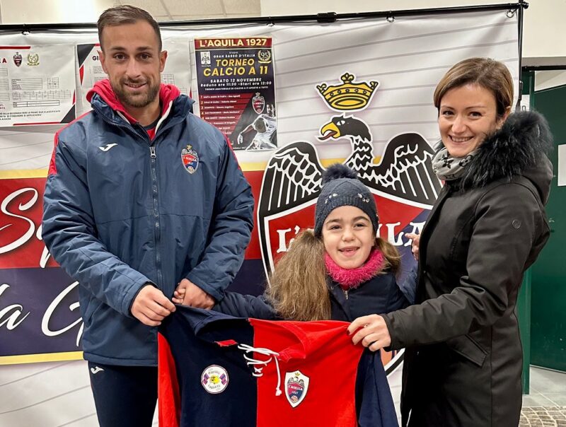 La solidarietà non ha confini, ma in questo caso ha due colori: il rosso e il blu. Sono quelli della maglia “Vintage” dell’Aquila Calcio indossata nell’occasione del 95ennale e orgogliosamente portata da Brunetti, capitano della squadra aquilana e dai suoi compagni