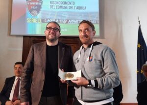Il sigillo della città a coronamento di una stagione da incorniciare, contrassegnata dalla vittoria del campionato regionale di Eccellenza e la promozione in serie D. A consegnarlo al tecnico dell’Aquila 1927, Massimo Epifani, è stato il sindaco, Pierluigi Biondi, estendendo il dono a società, squadra e staff tecnico-dirigenziale nel corso di un incontro che si è svolto questa mattina a Palazzo Fibbioni a cui hanno preso parte anche il senatore Guido Liris, l’assessore allo Sport, Vito Colonna, e i presidenti del sodalizio, Massimiliano Barberio e Salvatore Di Giovanni.