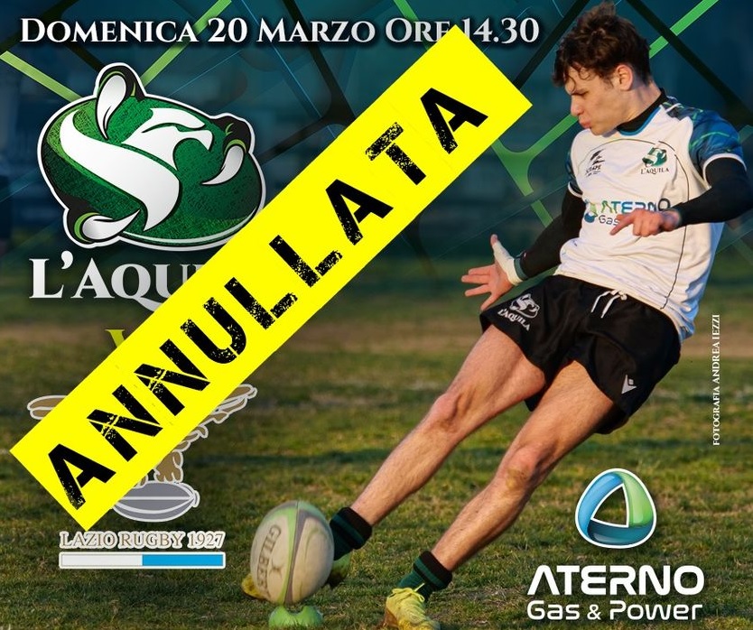 E’ stata annullata l’attesa partita della Rugby L’Aquila di domani domenica 20 marzo alle 14.30 allo stadio Tommaso Fattori, a seguito della decisione dell’avversaria, la Lazio rugby 1927, comunicata nella serata di ieri, di non disputare il match.